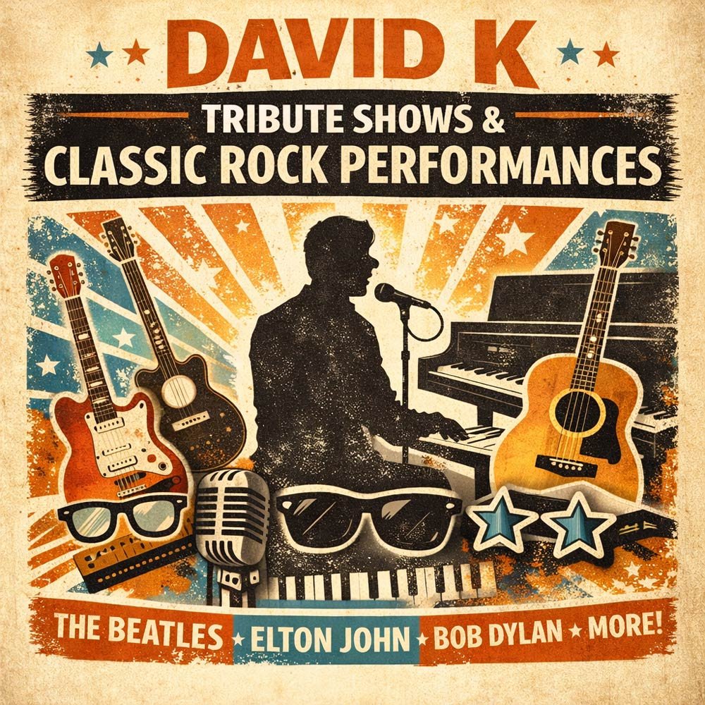 David K is a singer-songwriter, pianist, guitarist, and live performer known for heartfelt original songs and dynamic tribute performances. Influenced by legendary rock, folk, soul, and country artists, David combines powerful vocals, strong songwriting, and engaging stage presence to deliver memorable live music experiences for audiences everywhere.