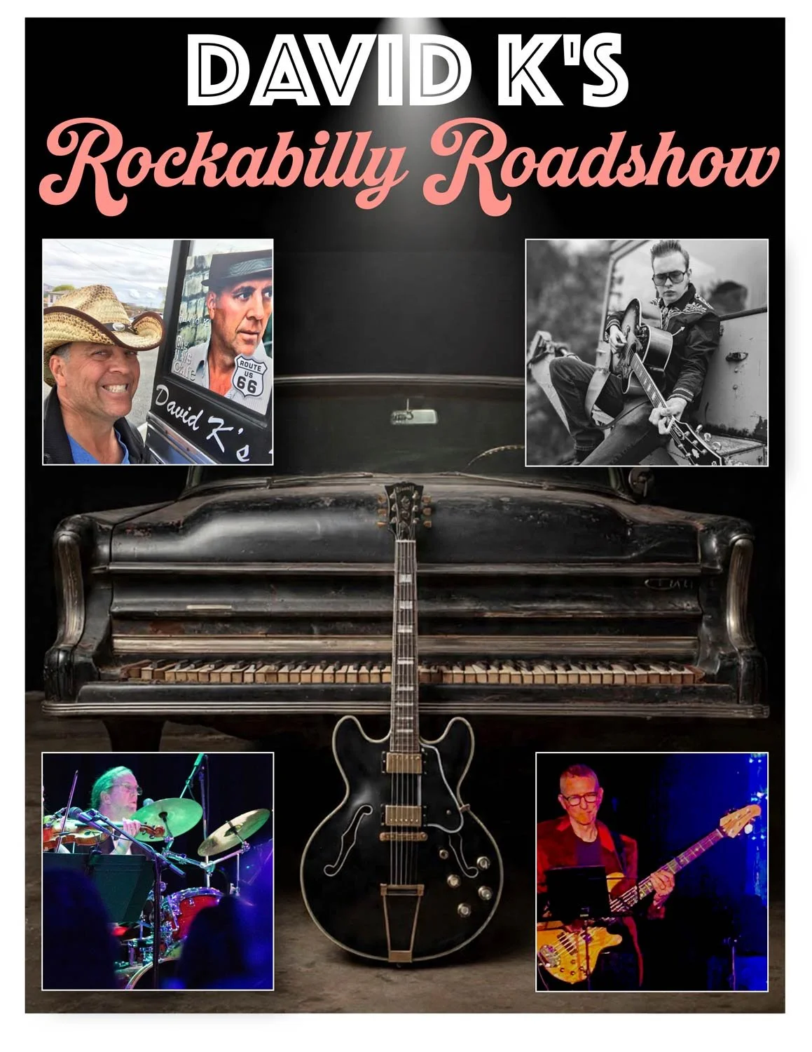 The David K Rockabilly Roadshow is a dynamic, roots-driven live performance built around the musical style and influences of David K, blending classic rockabilly with rock, country, soul, and pop traditions. Drawing inspiration from legends like Roy Orbison, Jerry Lee Lewis, Elvis Presley, Buddy Holly, Johnny Cash, Dell Shannon, Carl Perkins, Chuck Berry, Little Richard, Hank Williams, and more… the show combines original music, timeless covers, and versatile musicianship on piano, guitar, and vocals. With a seasoned stage presence developed across clubs, festivals, and national venues, the Roadshow delivers an engaging, high-energy experience that connects easily with audiences while celebrating the spirit and evolution of rock ‘n’ roll.