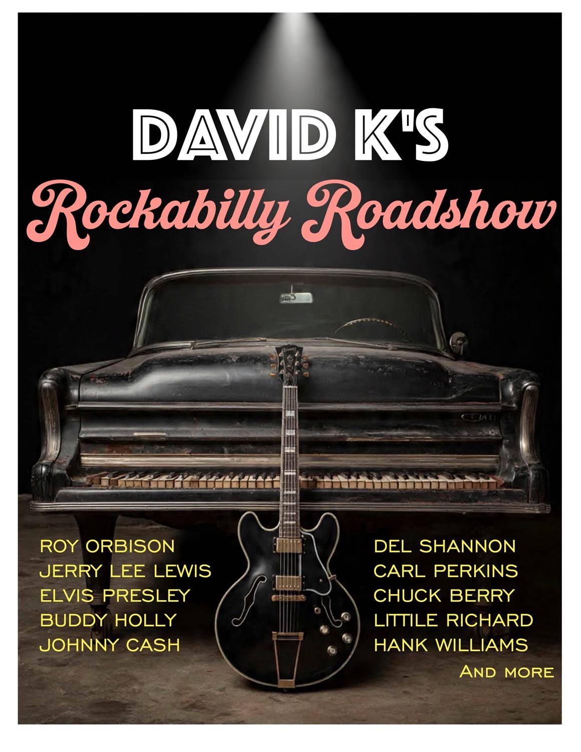 The Tribute Variety Show by the David K Rockabilly Roadshow 8-piece band is a dynamic, roots-driven live performance built around the musical style and influences of David K, blending classic rockabilly with rock, country, soul, and pop traditions. Drawing inspiration from legends like Johnny Cash, Jerry Lee Lewis, and Ray Charles, the show combines original music, timeless covers, and versatile musicianship on piano, guitar, and vocals. With a seasoned stage presence developed across clubs, festivals, and national venues, the Roadshow delivers an engaging, high-energy experience that connects easily with audiences while celebrating the spirit and evolution of rock ‘n’ roll.