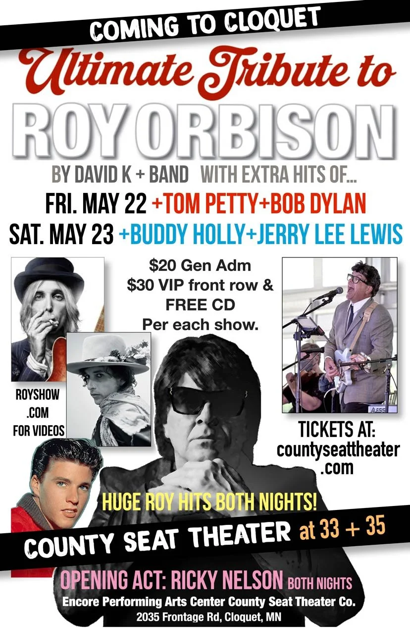 David K and his band have been performing tribute shows all over the nation for 6 years. David loves to play County Seat Theater as his father Alden Keiski was born in Cromwell and played basketball for 4 years at UMD where he went to college. See bio, photos, videos and more at www.royshow.com County Seat Theater is located at 2035 Frontage Rd, Cloquet, MN 55720 right near the intersection of 33 at 35. Call 218-878-0071 for more info.